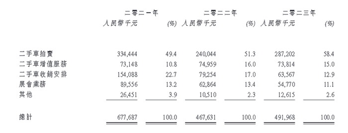 目前,汽车街核心业务涵盖二手车拍卖、二手车增值服务、二手车收销安排、展会业务这四大主要板块,其中,二手车拍卖业务是汽车街的主要收入来源,该业务通过向4S店和专业买家(主要是二手车商)提供的线上和线下拍卖服务中抽取佣金及服务费。2021年、2022年、2023年二手车拍卖营收为3.34亿元、2.4亿元、2.87亿元,分别占总营收的比重为49.4%、51.3%、58.4%。