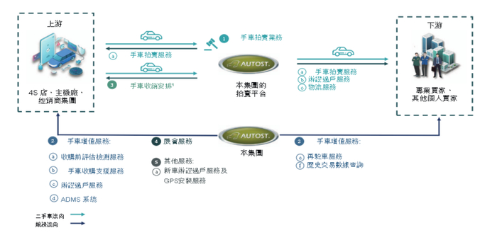 以下图片展示了汽车的业务分部及每个业务分部下提供的服务之间的关系。总的来看,汽车街通过线上、线下拍卖的形式,将大批量来自4S店、主机厂、经销商集团的二手车,卖给专业买家和其他个人买家,再由他们销售到终端市场。