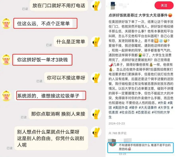 骑手歧视点拼好饭的,消费者就会反过来diss骑手。也有网友真诚地发问: