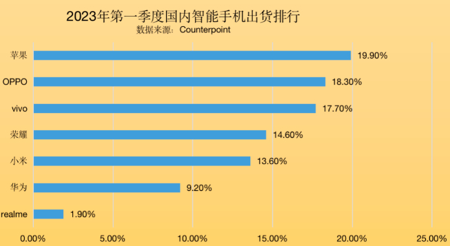 对比下图,2023年Q1国内手机市场的排名情况,可谓颠倒式剧变,尤其是苹果、小米之于华为。