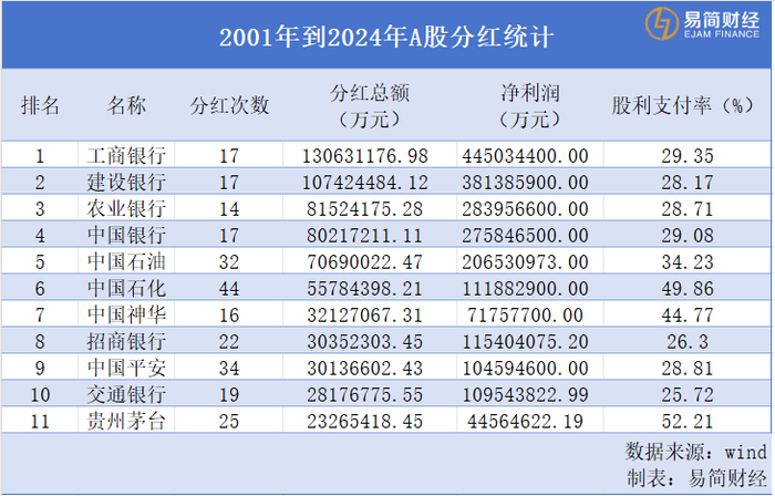 根据wind数据,贵州茅台自上市以来一共分红25次,上市以来累计付出的分红总额在A股上排名第11,名列前茅。