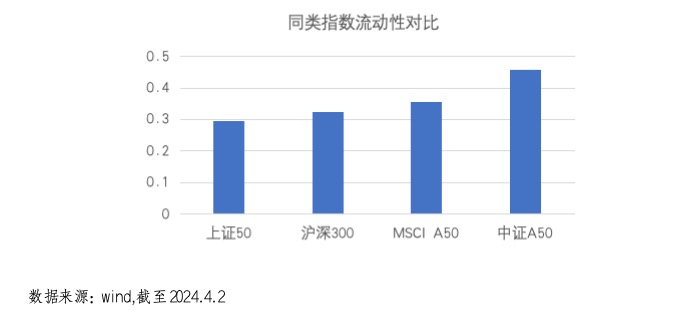 中证A50在编制过程中综合考虑总市值和自由流通市值,保证了成份股有更好的流通性,以实现指数更高的可投资性。2024年4月2日,中证A50指数成份股自由流通市值占总市值的比重为45.64%,高于上证50、沪深300和MSCI A50。