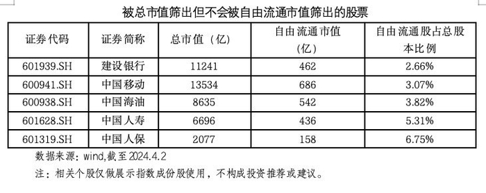 为直观展现其对指数成份的影响,我们分别根据总市值和自由流通市值筛选市值前50大股票,并对比其中的差异。可以看出,如果采用总市值进行选股,总市值大但自由流通市值小的公司将会被纳入成份股,如建设银行、中国移动和中国海油等公司,进而影响指数总体的自由流通市值占比。