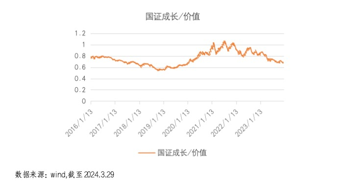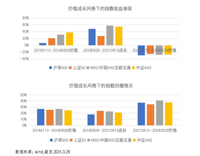 2016年以来,A股经历了两次价值风格占优,一次成长风格占优的市场行情。此处以国证成长指数和国证价值指数作为成长和价值风格的代理变量。本文将2016年以来的成长价值风格划分为3段,分别为2016年1月到2018年9月的价值风格、2018年9月到2021年9月的成长风格、2021年9月到2024年3月的价值风格。