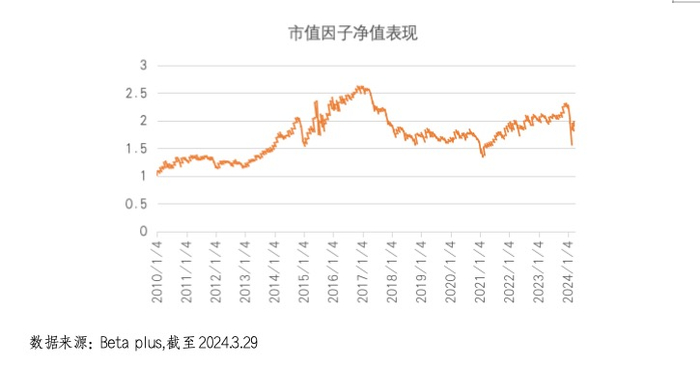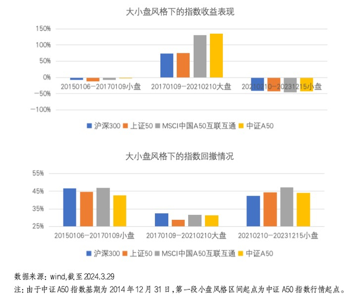 大小盘风格是A股市场最显著的特征之一。从历史上看,A股从2013年开始呈现大小盘风格特征。目前大小盘风格经历两次切换,周期一般为4年左右。基于Fama-French的A股市值因子,本文将2013年以来的大小盘风格划分为3段,分别为2013年1月到2017年1月的小盘风格、2017年1月到2021年2月的大盘风格、2021年2月到2023年12月的小盘风格。