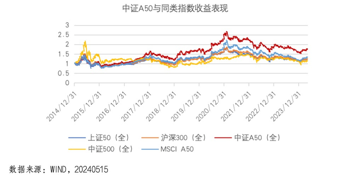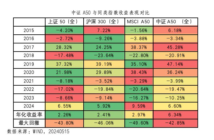 2014年12月31日到2024年5月15日,中证A50指数年化收益为6.60%,领先同类指数。