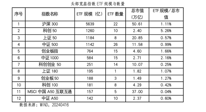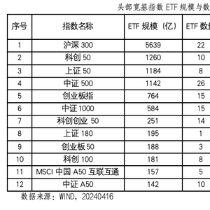 中证A50指数是代表核心资产的中国版“漂亮50”。根据2024年4月16日数据,目前排名前12的指数中,沪深300、MSCI A50和中证A50为全市场选股的大盘指数。其他指数,如科创50、上证50、创业板50等指数均为覆盖特定市场板块的宽基指数。中证500和中证1000分别是中盘和小盘股票的代表。