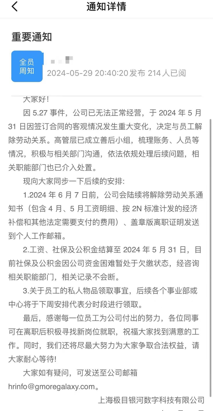记者从另一位员工处获得了一份极目科技于5月29日发布的通知,该通知内容显示,因“5.27事件”,公司已无法正常经营,于2024年5月31日因签订合同的客观情况发生重大变化,决定与员工解除劳动关系。高管层已成立善后小组,梳理账务、人员等情况,积极与相关部门沟通,依法依规处理后续问题,相关职能部门也已介入处置。