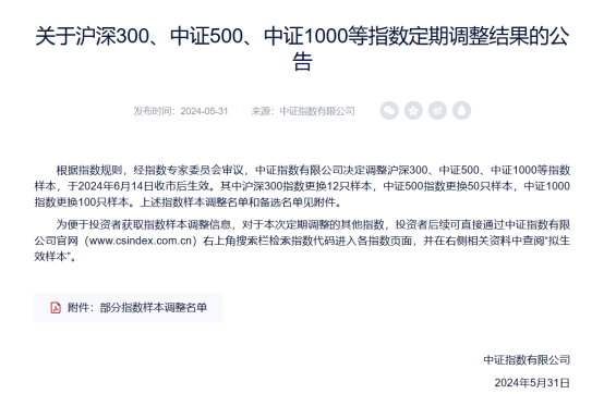 5月31日,中证指数有限公司发布公告称,将调整沪深300、中证500、中证1000、上证50、上证180、上证380和科创50等指数样本,此次调整为指数样本的定期例行调整,定期调整方案将于6月14日收市后正式生效。