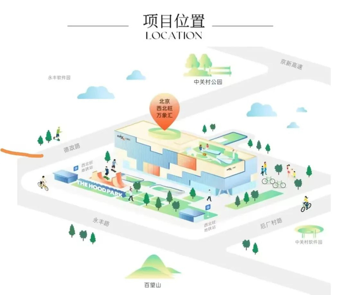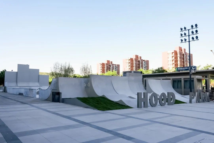 其中,“HOOD PARK”是京西北第一个与山林为伍的永久性滑板公园,以百望山石为设计灵感,将弧面、碗池、BankToBank等道具与建筑、景观和绿化设计相结合,以“滑板”为媒介链接社区与商业,创造一个有流动感和归属感的共享空间。