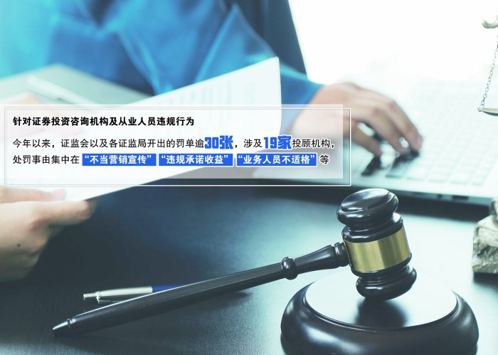 今年以来,针对证券投资咨询机构及从业人员的违规行为,证监会以及各证监局开出的罚单已逾30张,涉及19家投顾机构,处罚事由集中在“不当营销宣传”“违规承诺收益”“业务人员不适格”等沉疴旧疾上。