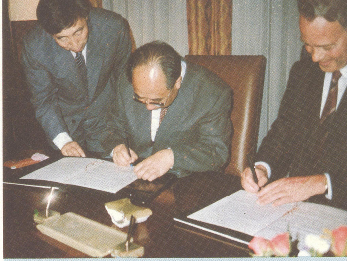 1984年9月6日,时任安徽省省长王郁昭和时任下萨克森州州长阿尔布莱希特共同签署《安徽省和下萨克森州关于缔结友好合作关系的联合声明》。(资料图片)