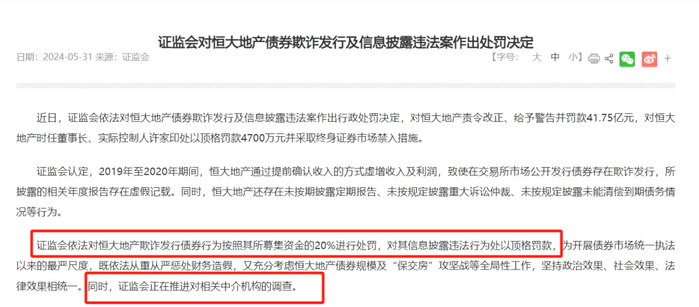 证监会称,此前对恒大地产债券欺诈发行的罚款是按照其募集资金的20%进行处罚,对恒大地产信披违规的罚单,和恒大地产时任董事长、实际控制人许家印的4700万元罚款是顶格罚款,而相关处罚也是开展债券市场统一执法以来的最严尺度。