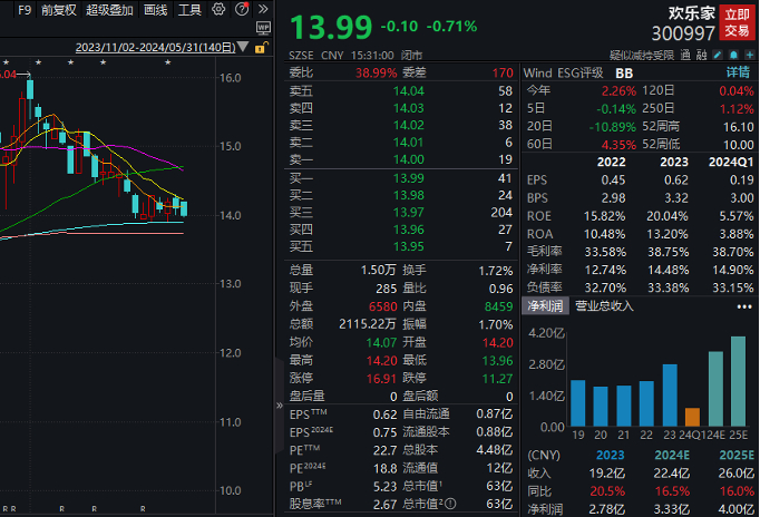 欢乐家坚持以水果罐头和椰子汁为双驱动的发展战略。2023年,公司实现营业收入19.23亿元,同比增长20.47%;归母净利润2.78亿元,同比增长36.85%,整体业绩表现强劲。