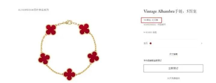 以梵克雅宝现售价4.08万元的“五花四叶草”红玉髓手链为例,主要材质为18K金、红玉髓,均不是贵金属或稀有宝石。