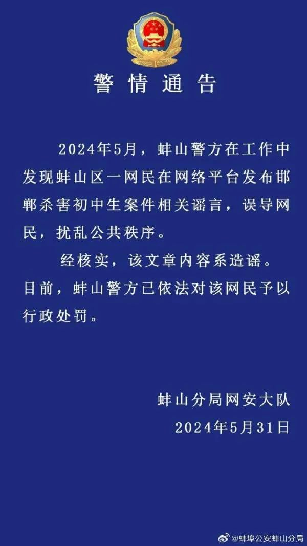 2024年5月,蚌山警方在工作中发现蚌山区一网民在网络平台发布邯郸杀害初中生案件相关谣言,误导网民,扰乱公共秩序。
