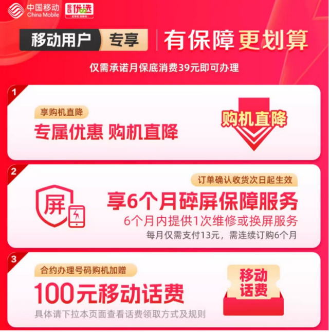 我在天猫中国移动官方旗舰店买的,办了移动合约,带6个月碎屏保障,用了250元平台券,还送了100元话费,算了下,价格很香!
