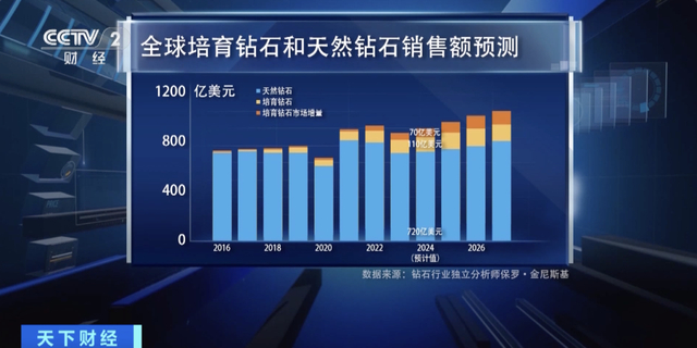 钻石行业独立分析师保罗·金尼斯基预计,2024年全球培育钻石的销售额将达到180亿美元,其中有70亿美元是对整体市场的增量,而到2026年,预计培育钻石还会给整体市场带来100亿美元(约合人民币724亿元)的增量。