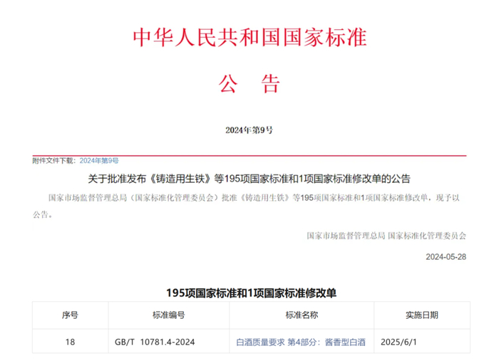 据贵州茅台消息,日前,国家市场监督管理总局(国家标准化管理委员会)发布《关于批准发布〈铸造用生铁〉等195项国家标准和1项国家标准修改单的公告》。其中GB/T 10781.4-2024《白酒质量要求 第4部分:酱香型白酒》上榜,将于2025年6月1日正式实施。该标准在贵州省市场监督管理局指导下由茅台牵头,并会同中食院有限公司、贵州省产品质量检验检测院、兄弟酒企等单位修订。