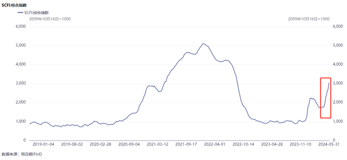 与今年1月红海停航导致欧线运价上涨,从而推升SCFI综合指数的情形有所不同。5月以来,全球各细分航线价格几乎无差别飙升。