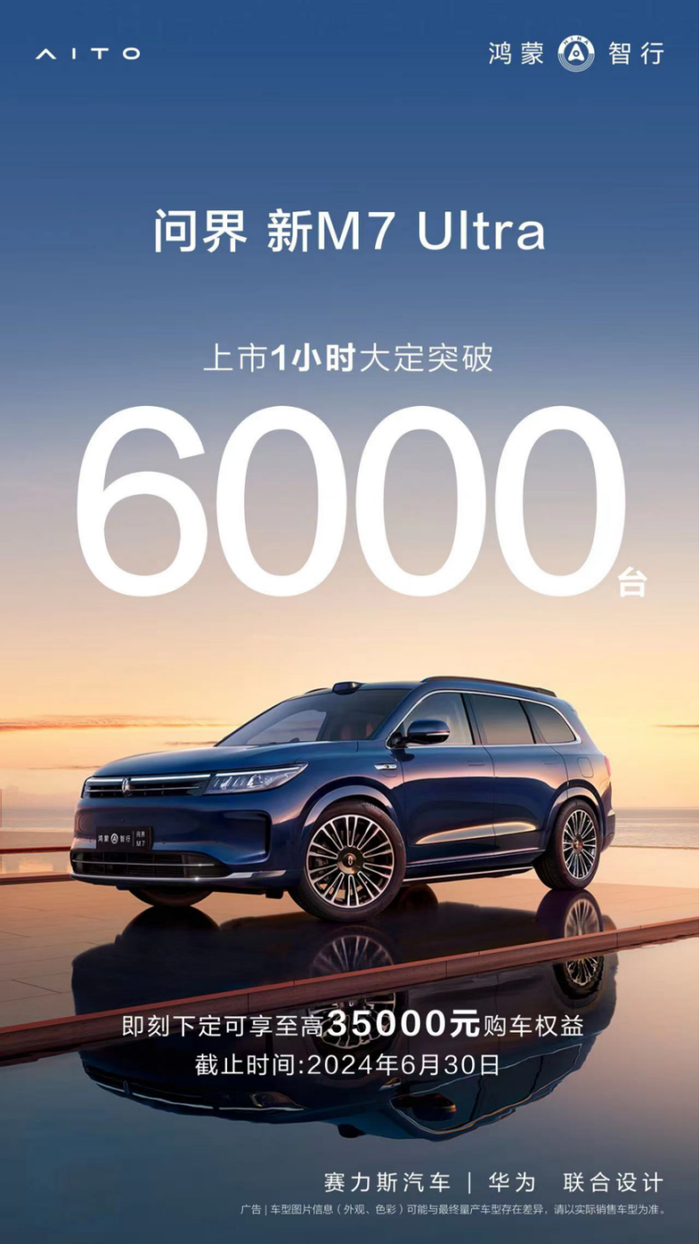 据悉,5月31日当晚,问界新M7 Ultra上市1小时大定突破6000台。