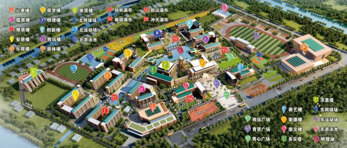 南沙华附校园环境优雅,凸显了自然与人文、科技与艺术、传统与现代的共存与融合。踏进学校,仿佛步入一座花园,秀树繁阴,花木成畦,连廊回绕,亭台错落;致远广场、育贤广场、育心广场、演艺舞台等大气磅礴,尽显环境育人特色;有图书馆、篮球馆、乒乓球馆、网球馆、击剑馆、饭堂、礼堂、4个露天网球场、2个塑胶跑道运动场、2个标准游泳池、10个塑胶篮球场、12栋学生公寓等,设施一流,功能完备,尽展湾区现代风采。