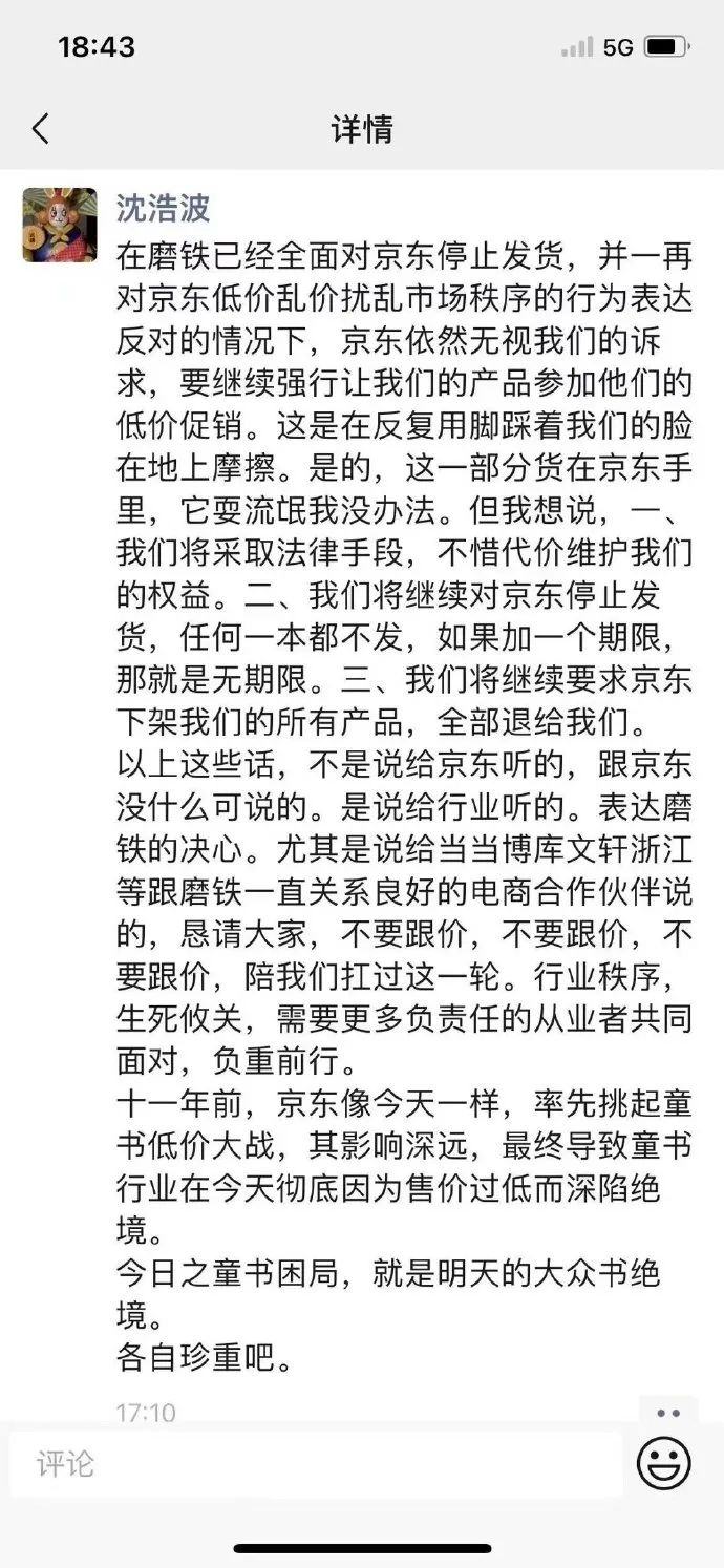 继京沪58家出版机构联合抵制京东618大促之后,5月31日,磨铁图书创始人沈浩波在社交平台发声宣布磨铁图书已全面对京东停止发货。据知情人士透露,还有多家出版机构也向京东发出断货、停货警告。