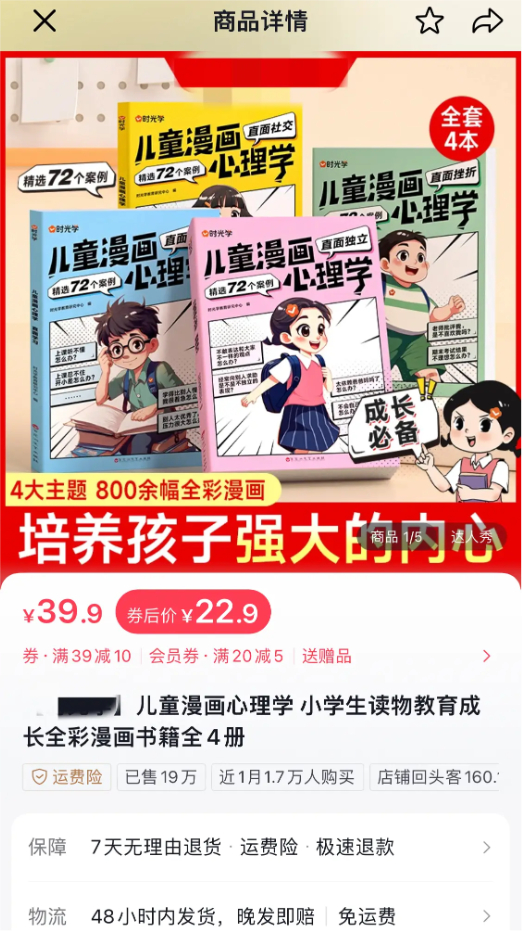 在某知名短视频平台的童书畅销榜上情况更加极端。已售10万+的一套4册童书售价22.9元包邮,平均一本不到6元,全彩印刷工艺,16开大开本(近似A4纸尺寸)。