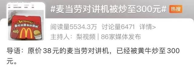 最近,麦当劳在六一节前推出的限量版玩具“麦麦对话机”连续登上热搜。一次是因为下单过于火爆导致系统延迟,小程序崩了,还有一次是因为原价38元的对讲机被黄牛炒到了300元。