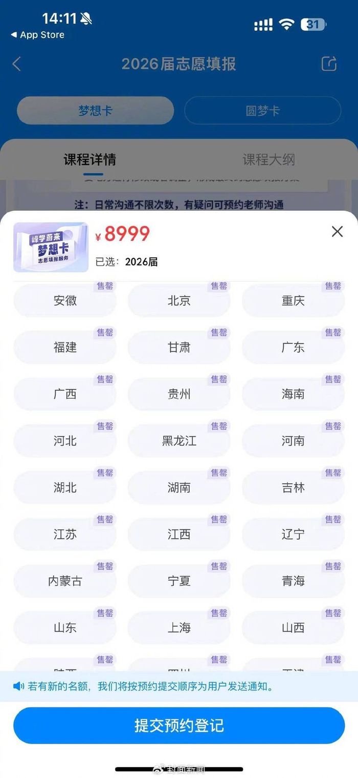 如今高考近在眼前,张雪峰的志愿填报服务也基本售罄,江西、重庆、湖南等省份相关服务已停售,其余省份仅剩极少数名额。记者看到就连2026届的相关服务所有省份都已经售罄。“咨询名额是不定期发放的,我是一直刷APP看放号没有,有些是加他们老师的粉丝群,一个月一次放号就会在群里通知,一般两小时就抢光。”江苏的王女士第三次抢号才抢到名额,据她称账号绑定一个学生,所以不能转售。