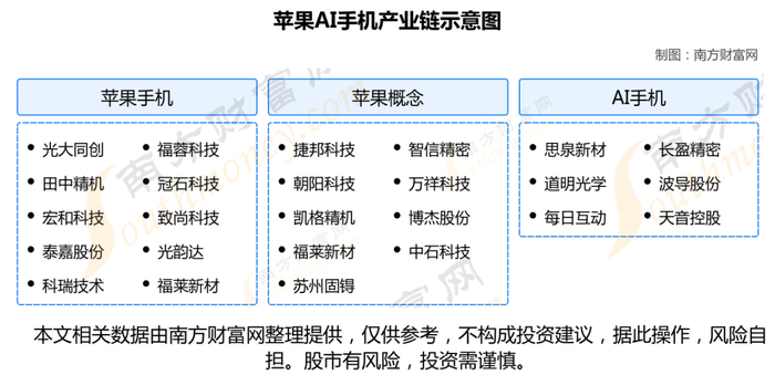 苹果AI手机产业链包含苹果手机、苹果概念、AI手机等环节。苹果手机公司主要包括光大同创、福蓉科技、田中精机、冠石科技、宏和科技、致尚科技、泰嘉股份、光韵达等;苹果概念公司主要包括捷邦科技、智信精密、朝阳科技、万祥科技、凯格精机、博杰股份、福莱新材、中石科技等;AI手机公司主要包括思泉新材、长盈精密、道明光学、波导股份、每日互动、天音控股。