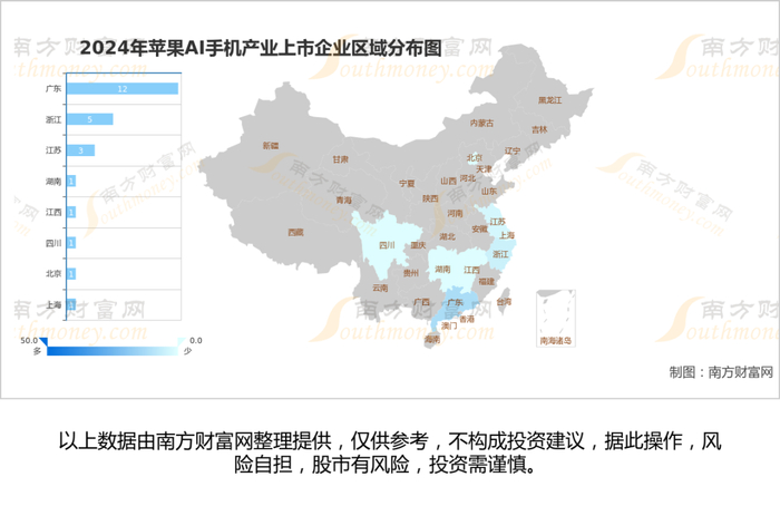 从上市公司地区的分布情况来看,A股25家苹果AI手机相关上市公司分布在广东、浙江、江苏、上海、北京等省市,总体来看主要集中于华南区域。