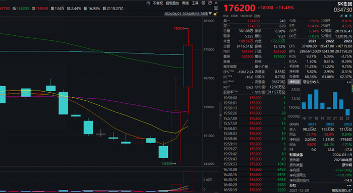 在韩国首尔高等法院作出二审判决的当天,即5月30日,SK集团的股价一度大涨超16%,创出近四年来最大涨幅,最终收涨9.26%。5月31日,SK集团股价继续飙涨,收盘时涨幅超过11%。