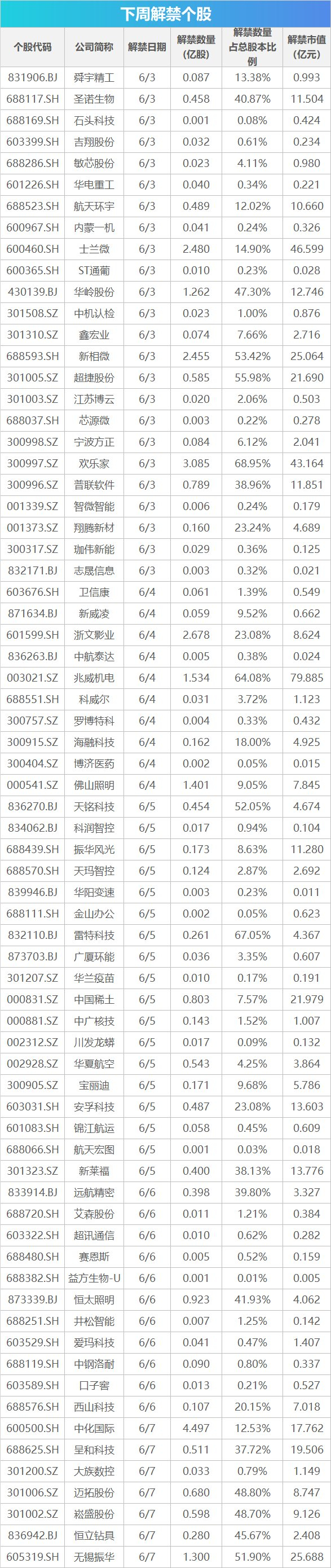Wind数据统计显示,下周(6月3日-6月7日)共有70家公司限售股陆续解禁,合计解禁31.39亿股,按5月31日收盘价计算,解禁总市值为489.35亿元。
