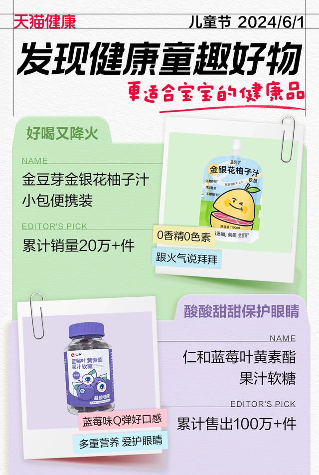 去年8月上市的金银花柚子汁,618开门红期间已经跻身天猫养生茶热销榜单TOP10;添加了叶黄素、胡萝卜素等营养元素的“叶黄素酯蓝莓味软糖”累计售出超过100万件;其他诸如中医养生流派的鸡内金棒棒糖,维生素K成分的儿童饮料、山楂味益生菌糖果、氨基丁酸γ 配方的DHA饮品、秋梨膏棒棒糖等一众“零食化”的儿童营养滋补品,也都在今年天猫618线上走俏。