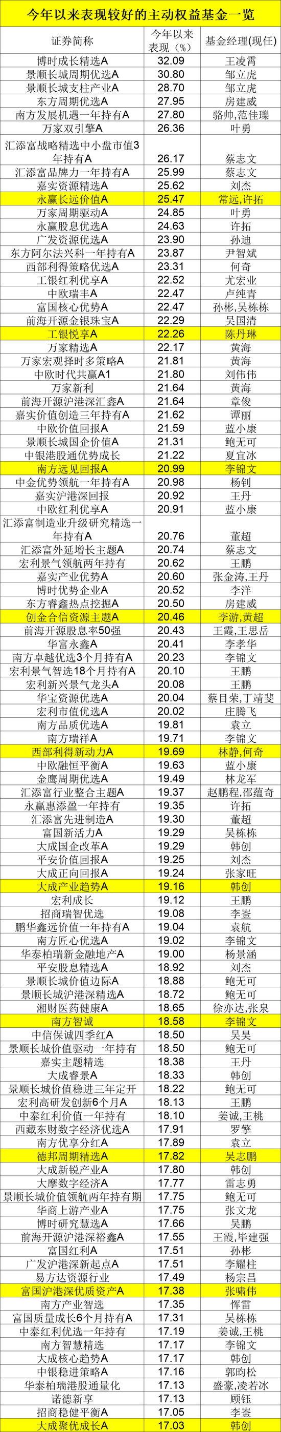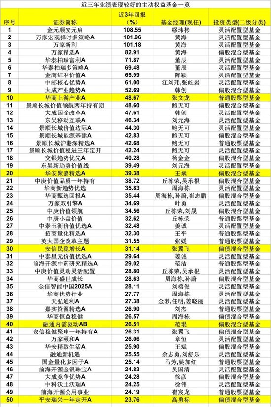 从三年维度的中期业绩来看,一些主动权益基金仍有所表现。