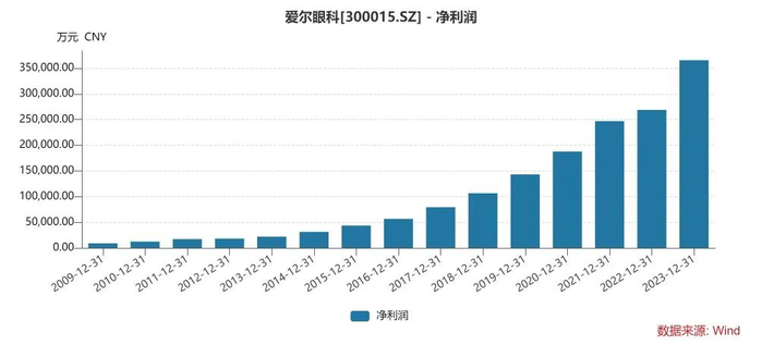 根据Wind相关数据计算,从2009年上市至2023年,爱尔眼科营收增长了32.58倍,净利润增长了39.66倍。