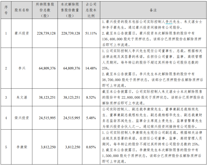 欢乐家本次限售股解禁明细