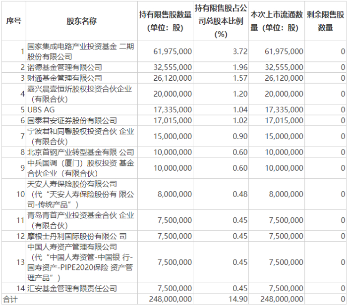 士兰微本次限售股解禁明细