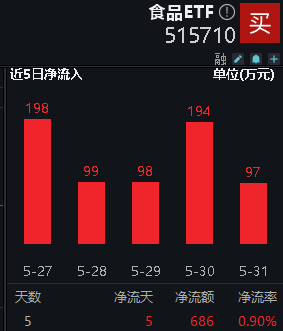有很多资金已经意识到了这一点,趁着近几天板块回调之际加速逢低吸筹。以食品ETF(515710)为例,数据显示,截至5月31日,食品ETF(515710)已连续6日获资金加仓,且近5日累计加仓金额近700万元。