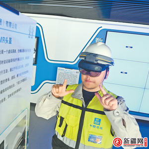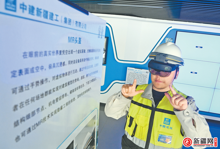5月30日,在新疆医科大学第八附属医院公共卫生救治中心项目智慧建造展厅,工作人员通过MR智能头盔体验虚拟场景。(全媒体记者陈岩摄)