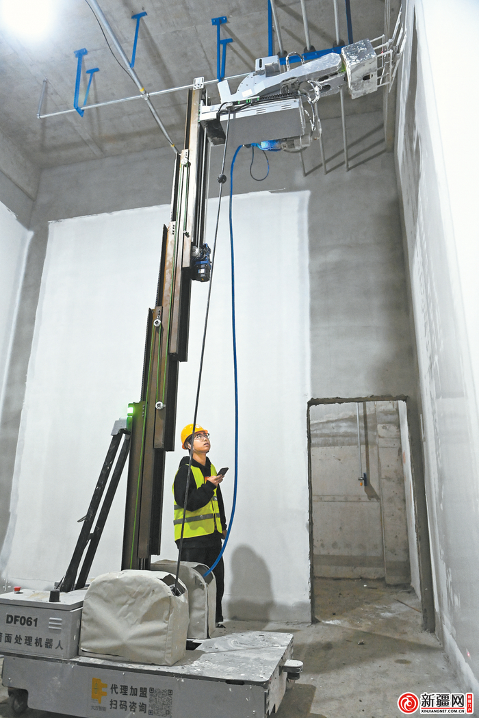 在乌鲁木齐两港产业园二期项目施工现场,一台墙面喷刮打磨一体机器人缓缓移动到墙壁前,开始自动喷涂作业。不到20分钟,70平方米大小的墙面就被均匀平整地涂抹上了腻子。
