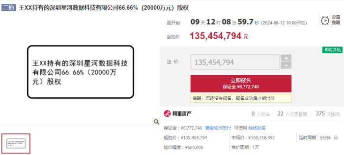 6月2日,群兴玩具近期通过网络查询获悉,王叁寿因与李某的民间借贷纠纷,被李某起诉,由浙江省杭州市中级人民法院(下称“法院”)审理。现该案已进入执行程序,李某申请拍卖王叁寿持有的群兴玩具第一大股东深圳星河数据科技有限公司(下称“深圳星河”)66.66%的股权,起拍价是1.35亿元。此次拍卖将于2024年6月12日至6月13日在司法拍卖网络平台上进行。