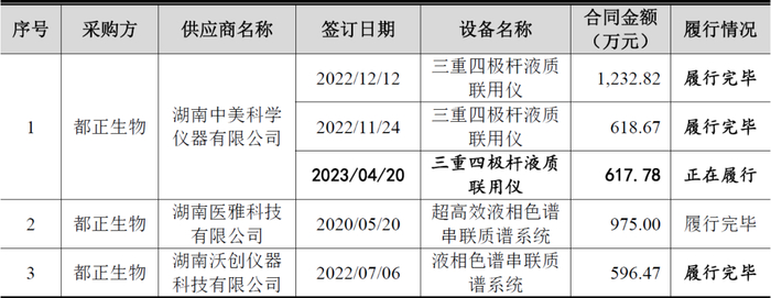 从发行人披露的单笔金额在500万元以上的设备采购合同情况,也可见发行人报告期内已采购的大型检测设备,具体如下图所示: