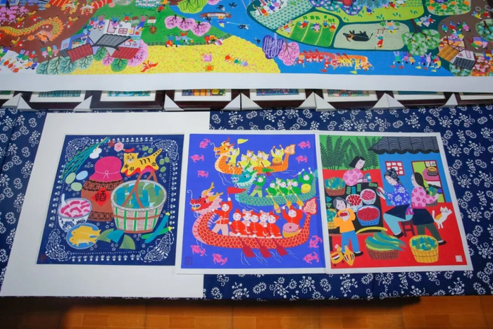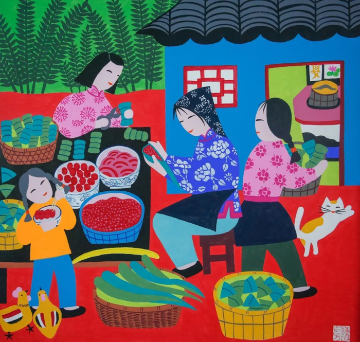此外,《赛龙舟》《端午包粽子》等作品也同样充满趣味。陈惠方告诉记者,农民画画的是生活,也是画家对生活的感悟。“现在很多年轻人对传统习俗并不是很了解,我希望通过我的画,用简洁的笔触和浓烈的色彩,让他们对这些习俗产生兴趣、留下深刻记忆,将端午等节日的习俗与精神内涵传递给更多的人”。