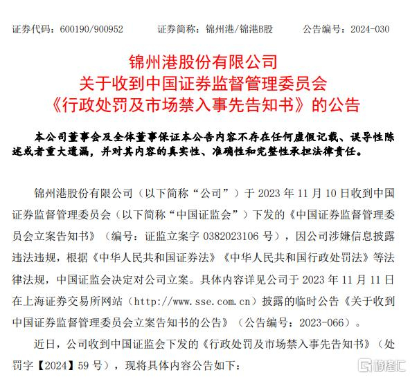 锦州港6月1日公告,收到中国证监会下发的《行政处罚及市场禁入事先告知书》,公司2018年至2021年年报存在虚假记载,证监会决定对公司责令改正,给予警告,并处以800万元罚款等。