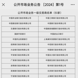 随着上述两家银行的位置变动,在全部51家公开市场业务一级交易商中,包括了全部6家国有大行和全部12家全国股份制商业银行、2家政策性银行和1家开发性金融机构、部分城商行、农商行和外资行,中信证券和中金公司两家券商以及负责民营企业债券融资支持工具实施的中债信用增进投资股份有限公司。