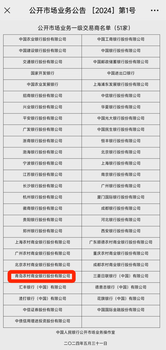 央行发布公开市场业务一级交易商名单 青岛农商银行入围、青岛银行出局