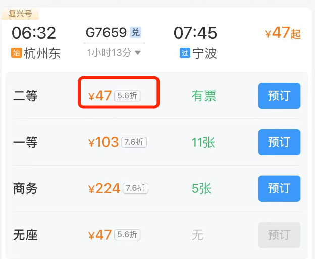 以杭深铁路杭甬段举例,杭州东站到宁波站二等座6月15日当天最低5.6折起,折后价格显示为47元。