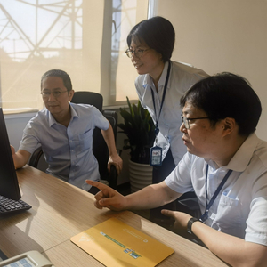 图为员工讨论新一体化物流综合管控平台的建设方案
